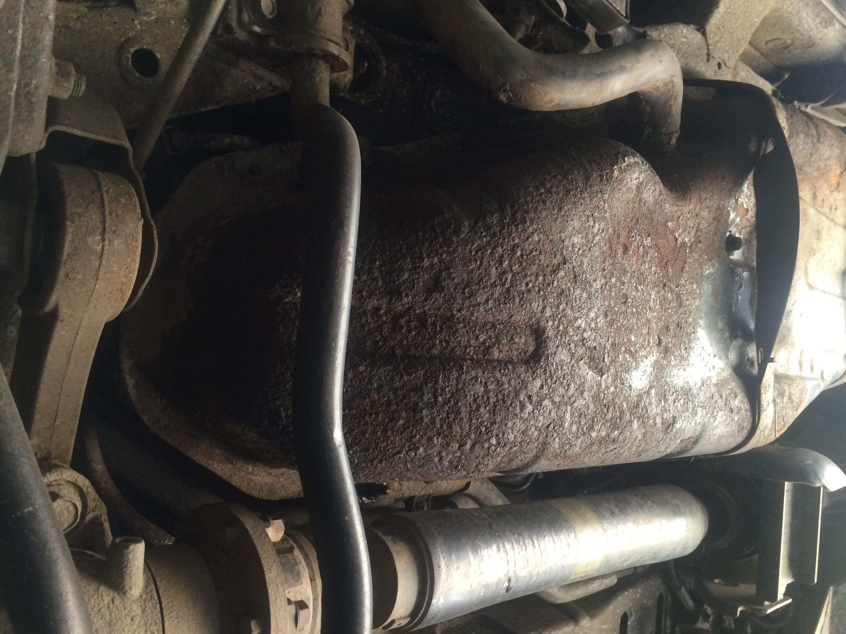 Заливная труба в арке заднего правого колеса. Она частично покрыта аникором, доставшимся ей при обработке арок три года назад. Но внизу на сгибе видно, что в свое время антикор туда не попал, заводское напыление обвалилось и торчит железо.
